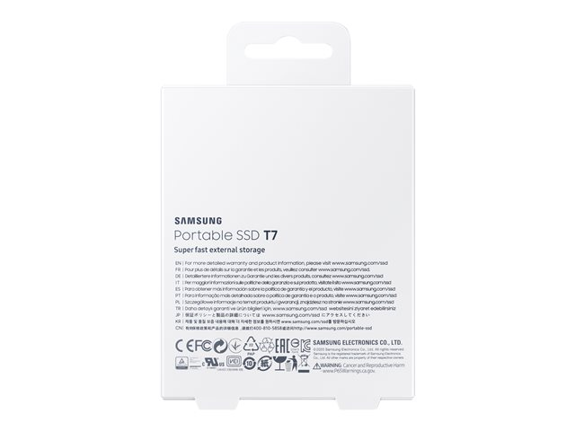 Description du produit Samsung T7 MU-PC2T0H - SSD - 2 To - USB 3.2 Gen 2 Type Lecteur à semi-conducteurs - externe (portable) Capacité 2 To Cryptage matériel Oui Algorithme de chiffrement AES 256 bits Interface USB 3.2 Gen 2 - USB-C Débit de transfert de données 10,0 Gbps (USB 3.2 de 2e génération) Caractéristiques Antichoc, authentification du mot de passe, Dynamic Thermal Guard protection, NVM Express (NVMe), AES 256 bits Source d'alimentation Bus USB Couleur du boîtier Bleu indigo Dimensions (LxPxH) 85 mm x 8 mm x 57 mm Poids 58 g Garantie du fabricant Garantie de 3 ans -