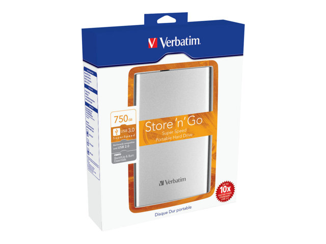 Le disque dur portable Verbatim Store 'n' Go est une solution de stockage hautes performances qui utilise une interface USB 3.0 haute vitesse. La norme USB 3.0 permet d'atteindre des débits multipliés par 10 par rapport à l'USB 2.0 (sur la base de mesure de la vitesse de bus USB), vous offrant un taux de transfert de données ultra-rapide.